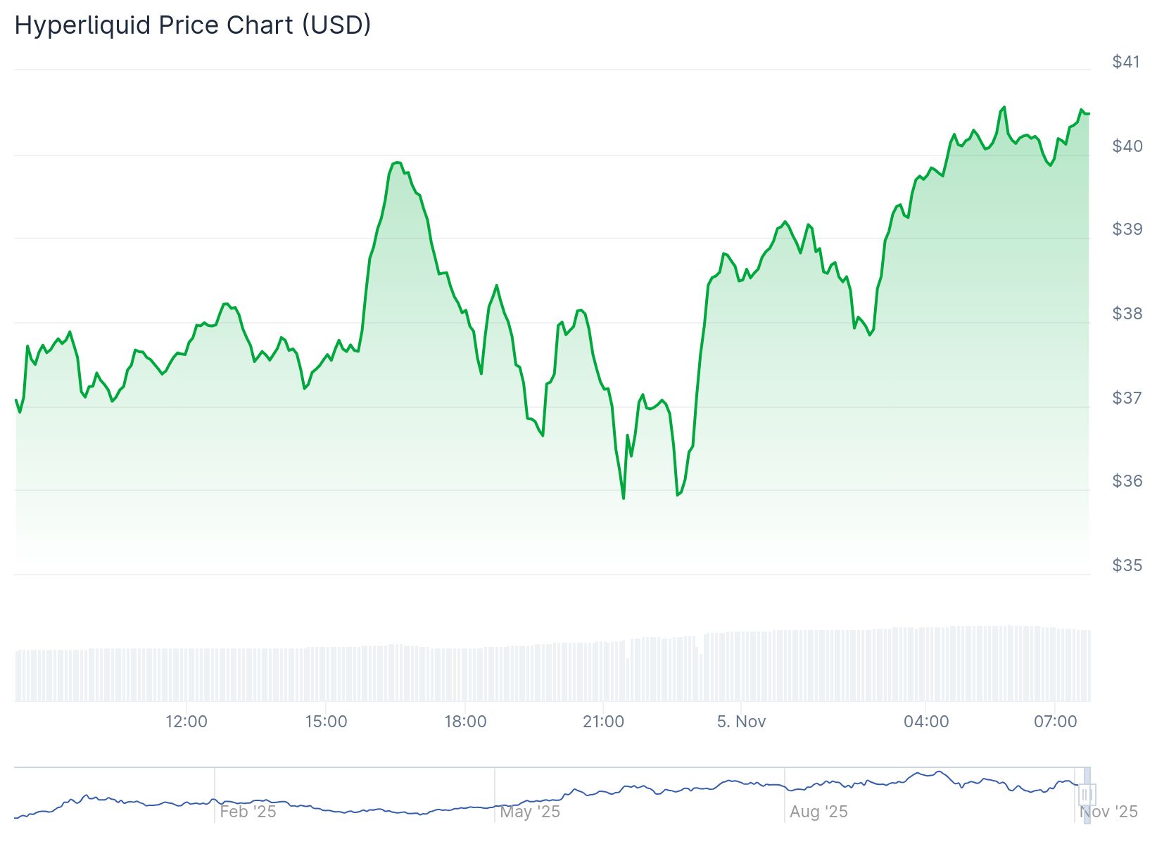 Az elmúlt 24 óra másik nagy nyertese a Hyperliquid lett, amely 24 óra alatt 8,6%-os emelkedést produkált. Aktuálisan a coin ára 40 dollár környékén mozog, ami egyébként csak rövidtávú növekedést jelez, hiszen 7 napra és 30 napra levetítve is komoly veszteségben van a HYPE.