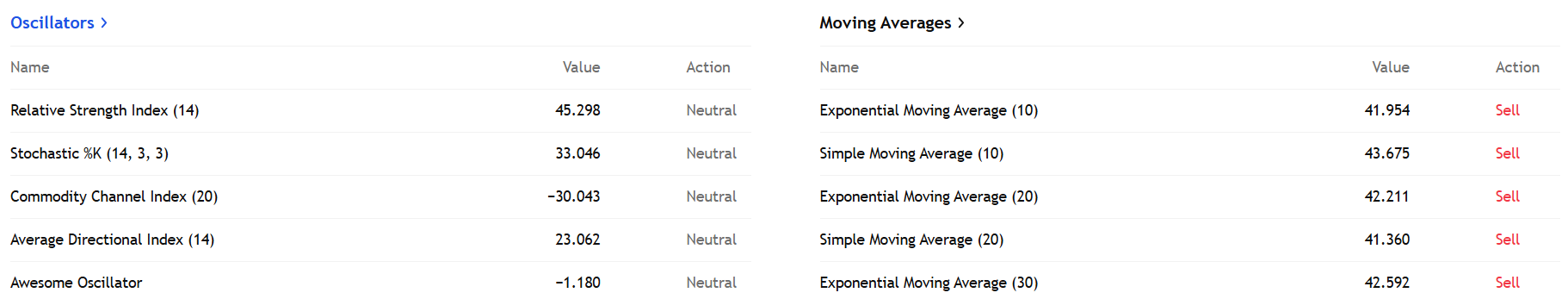 A két hónapja elért 59 dolláros árfolyamcsúcsától pedig nagyon messze van. A 45 körüli RSI érték semleges trendet jelez, míg a 33-as sztochasztikus %K még nem ad egyértelmű jelet, ahogy a 20-as CCI indicator sem. Mind az egyszerű (SMA), mind az exponenciális mozgóátlagok (EMA) 10, 20 és 30 napos időtávon a jelenlegi ár alatt helyezkednek el, ami nem túl erős, inkább rövidtávú lendületet mutat.