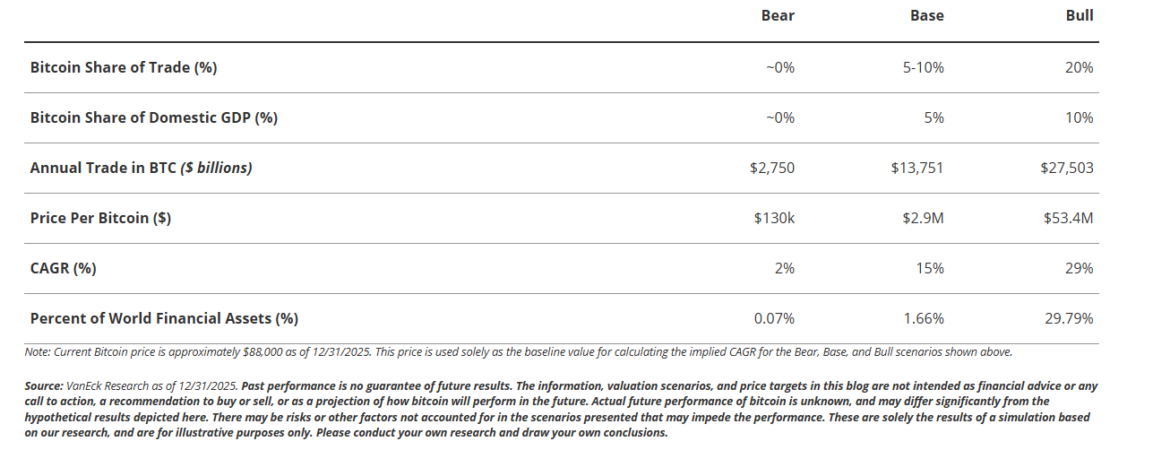 A blogbejegyzés a becslés célárként való megfogalmazása helyett egy olyan értékelési gyakorlatot ír le, amely arra összpontosít, hogy a bitcoin hogyan használható fel, ha az elfogadás jelentősen túlmutat a jelenlegi kereskedési eszköz szerepén. VanEck keretrendszere nem a hagyományos részvényértékelési mérőszámokra támaszkodik, hanem bevezetési forgatókönyveken keresztül modellezi a bitcoin értékét.