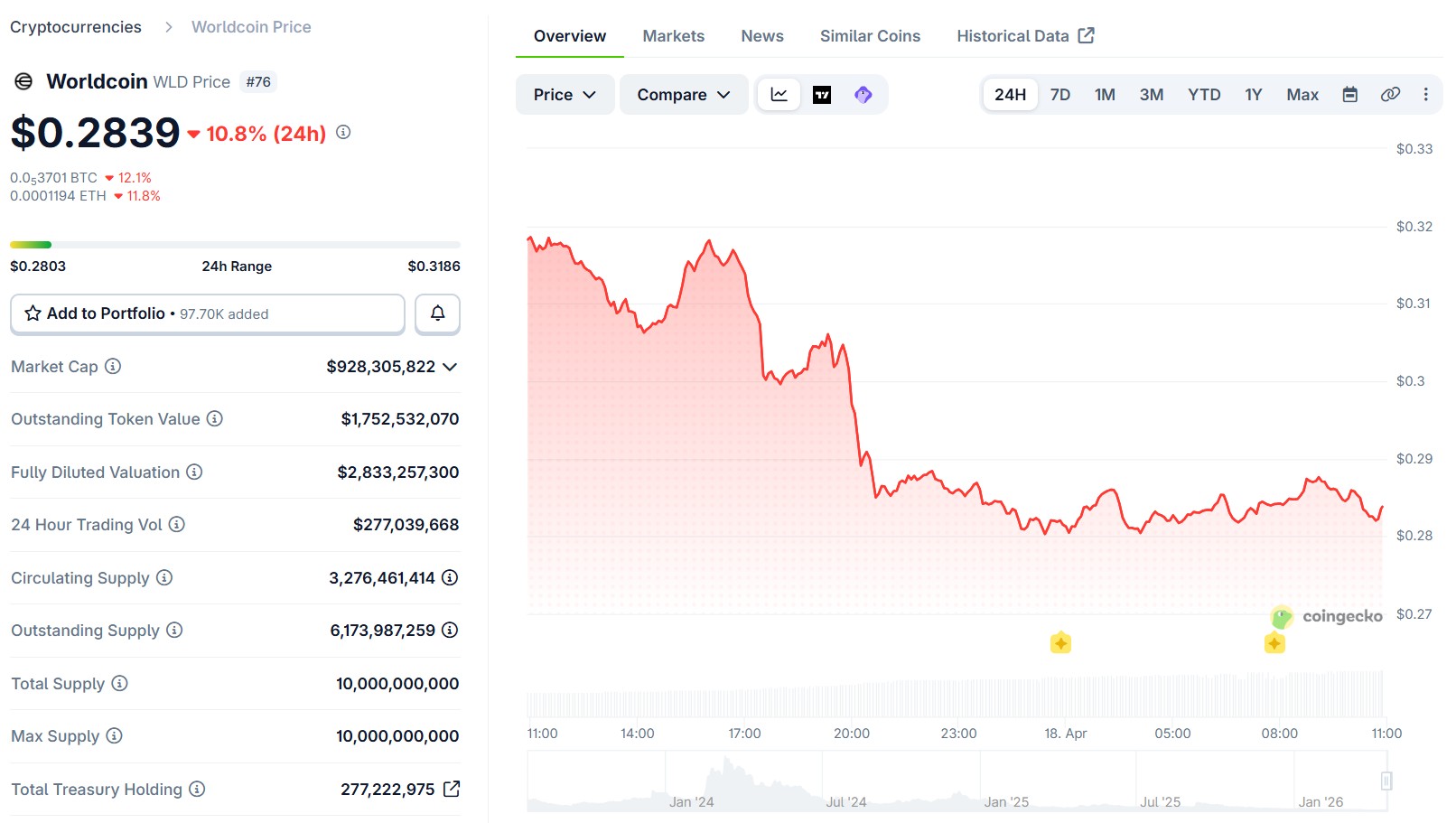 A technológiai bejelentések ellenére a WLD árfolyama esett, ráadásul egy olyan napon, amikor a teljes kriptopiac 2,2%-os emelkedést mutatott. A token a World Network ökoszisztémájának natív eszköze: a felhasználók jutalomként kaphatják az azonosításért, illetve tranzakciókra és a hálózatban való részvételre használható.