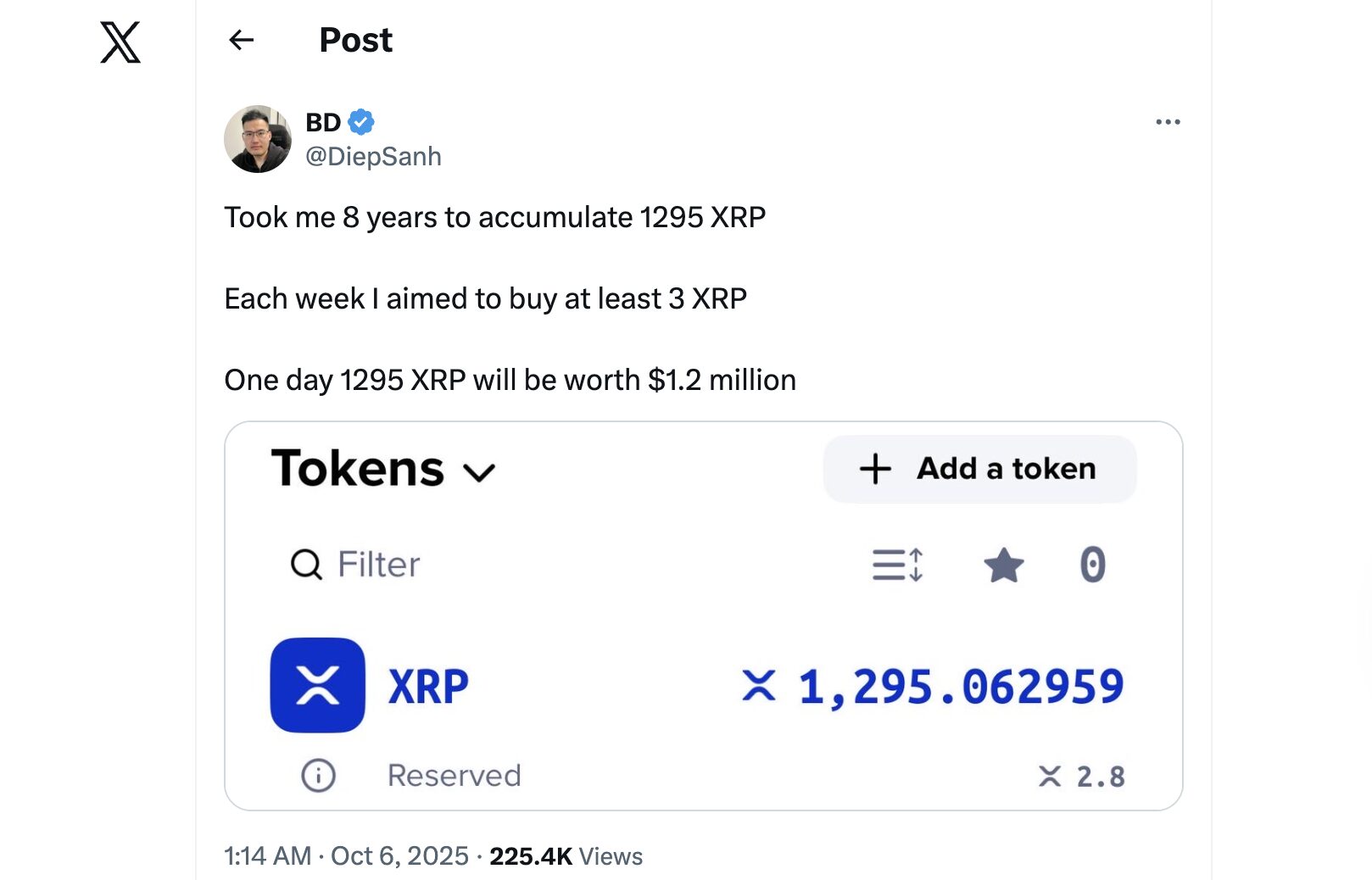 Egy ausztrál XRP-befektető – Diep Sanh – a közelmúltban osztotta meg történetét az X-en (korábban Twitteren). Elmondása szerint nyolc évbe telt, mire összegyűjtött 1295 XRP-t, kitartóan vásárolva hetente legalább hármat – függetlenül az árfolyamtól vagy a piaci helyzettől.