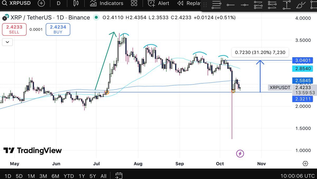 Október 14. és 15. között az XRP árfolyama 2,49 dollárról 2,41 dollárra esett vissza, miután nagybefektetők 2,23 milliárd tokent mozgattak tőzsdékre. Ez a likvidálási hullám közel 10 milliárd dollárnyi piaci értéket törölt el. A finanszírozási ráták negatívvá váltak, ami a tőkeáttételes kereskedők óvatosságát jelezte.