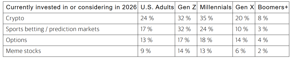 A vagyonkezelő jelentéséből az is kiderül, hogy a Z generáció 32%-a már fontolgat, vagy eszközölt is befektetést a digitális eszközökbe, és ugyanilyen arányban érdeklődnek a sportfogadás, vagy a predikciós piacok iránt – mint amilyen például a Polymarket. Gondolkozzunk el egy pillanatra, hogy bár sokkal békésebb világot élünk, mint száz évvel ezelőtt, normális-e, hogy olyan körülmények alakultak ki, hogy a végtelen tudás, a digitalizáció és a béke mellett egy fiatal tudatosan fordul a kockázatos eszközök és a sportfogadás felé, mert azt érzi, hogy a konzervatív lehetőségek nem vezetnek sehova!