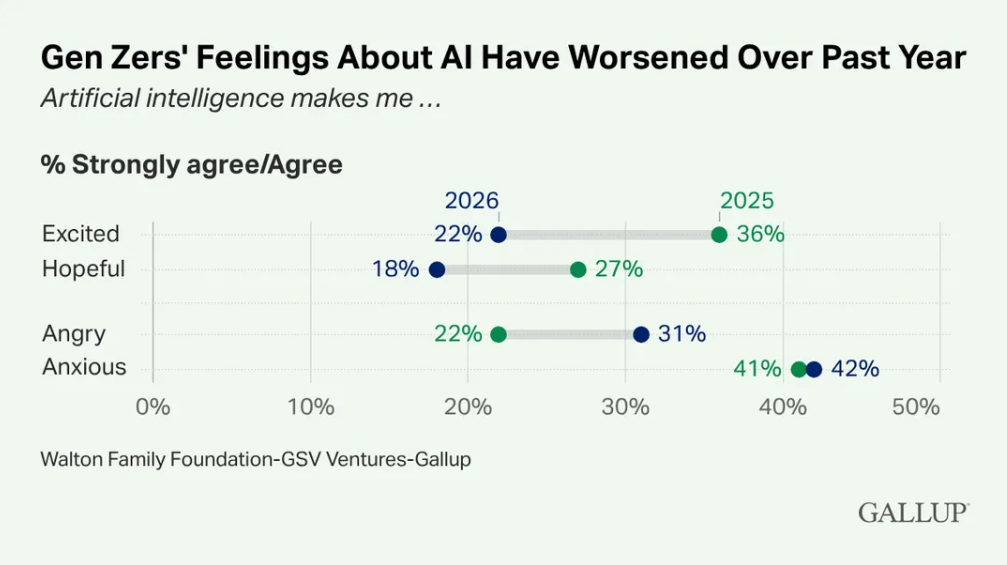 Zach Hrynowski kutató szerint a Z generáció szülöttei egyre szkeptikusabbak, egyre negatívabb érzések fogalmazódnak meg bennük annak ellenére, hogy már tavaly sem voltak túl derülátók. A kutatásban résztvevők 80%-a szerint az AI gyorsítja a munkájukat, de roncsolja a tanulást és függőséget szül – korábbi kutatások összekötik például a ChatGPT túlzott használatát a halogatással és a memóriazavarral, miután minden apróságról az AI-t kérdezik meg az emberek.