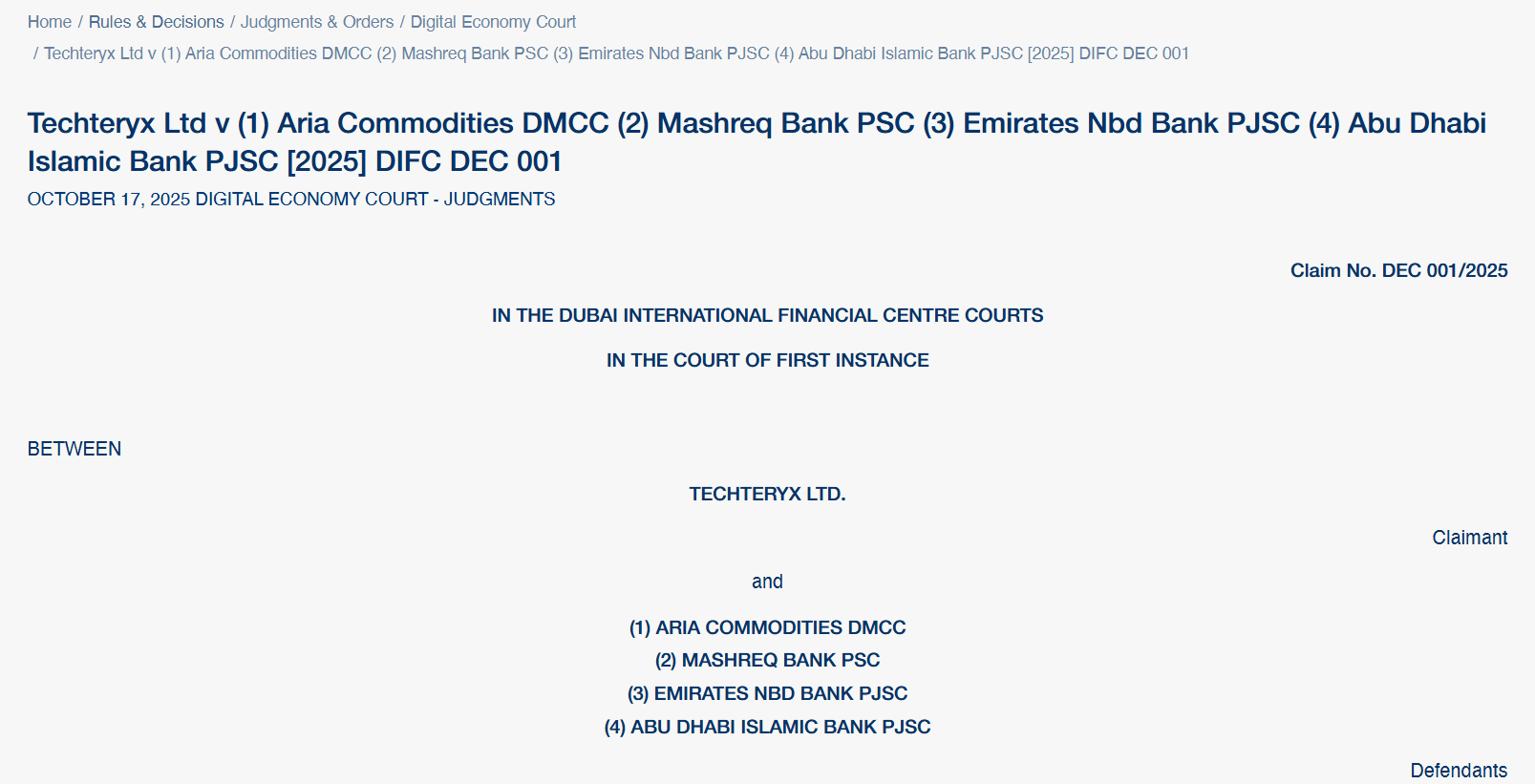 Korábban egy nyilatkozatban Matthew Brittain azt mondta, hogy a likviditási kérdések inkább a futamidőre vonatkozó kötelezettségvállalásokkal kapcsolatosak. Azt is állította, hogy az Aria stratégiája nem megfelelő és sosem volt az stabilcoinok kezelésére. 2025. október 17-i ítéletében Michael Black KC bíró, a dubaji Digital Economy Court (DEC) vezető bírája úgy fogalmazott, hogy a Techteryx komoly, tárgyalásra érdemes kérdéseket vetett fel, és hogy a pénzeszközöket be kell fagyasztani, hogy azok ne kerülhessenek áthelyezésre vagy elrejtésre, mielőtt a hongkongi bíróságok megállapíthatnák a tulajdonjogot. Black indoklásában azt mondta, hogy a Techteryx hitelesen bizonyította, hogy a a pénz, amit Aria Commodities DMCC kapott, bizalmi alapon volt kezelve, tehát nem lett volna szabad saját célra felhasználni.
