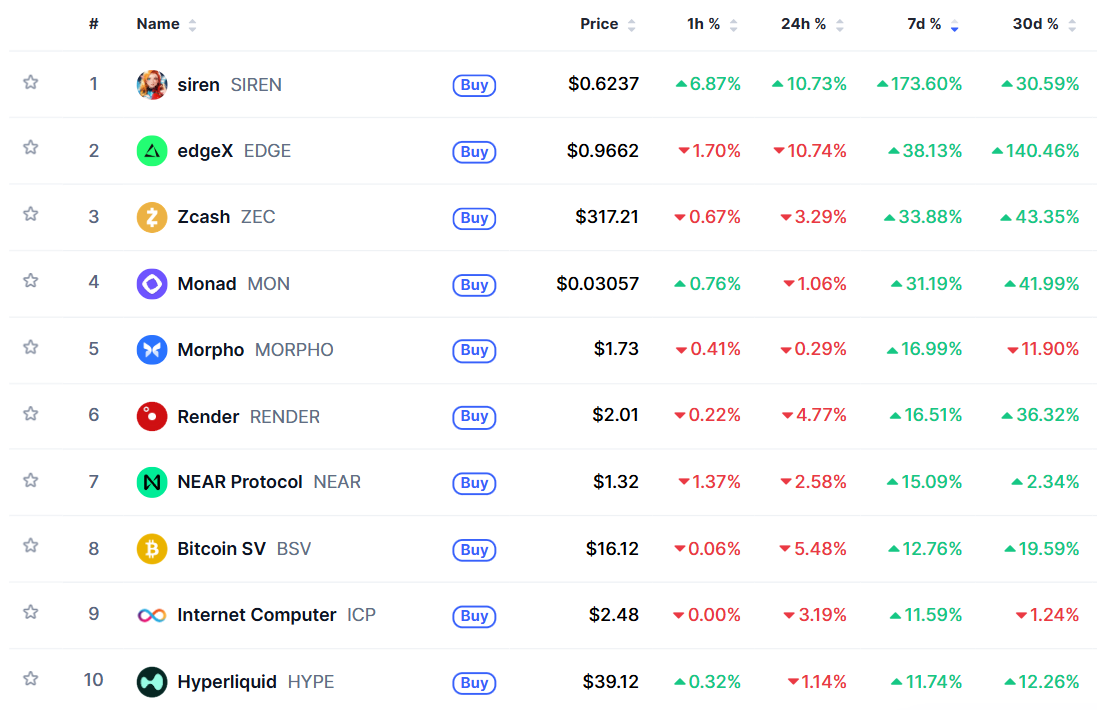 A vezető altcoinok listája az elmúlt heti teljesítmény alapján, forrás: CoinMarketCap