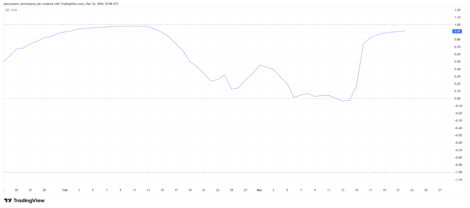 2025-tel ellentétben, a ZEC árfolyama most a BTC-vel szinte teljes korrelációt mutat, vagyis a két eszköz árfolyama 91%-ban azonos mozgást produkál. Korábban, március elején, ez a mutató 5-10% körül ingadozott, vagyis a Zcashre mindig is jellemző volt, hogy a piaccal teljesen ellentétes irányt járjon be.