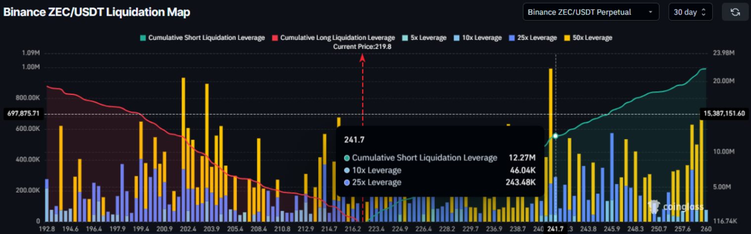 A CoinGlass adatai szerint március 18-án, amikor a kriptovaluta-piac közel 5%-ot vesztett az értékéből, közel 400 millió long (vételi) pozíciót számoltak fel a likvidációk, ez pedig a ZEC-et sem kímélte. A Binance összegyűjtötte, mi is történt a ZEC/USDT határidős szerződésekkel, a likvidációs térképen pedig az látszik, hogy 240 dollár felett több mint 15 millió dollárnyi short (eladási) pozíció aktiválódott.